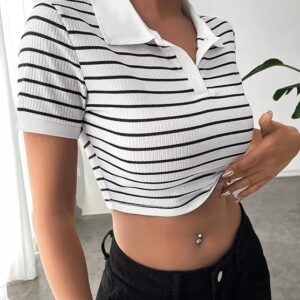 Women Polyester Striped Slim Fit Crop Polo Collar Short Sleeve T-Shirt